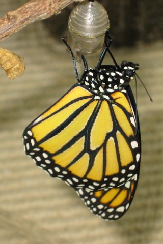 After a short time, the caterpillar attached itself to the lid of the jar and formed a beautiful green chrysalis, ornamented with gold flecks. I was so excited at this development that I wanted to share the experience. I took the jar into my second grade class, and there it sat on the windowsill for what seemed like an eternity, but was actually about two weeks. Finally, one morning, we arrived at school to find that from the chrysalis had emerged a regal Monarch butterfly. It was an experience I would never forget.